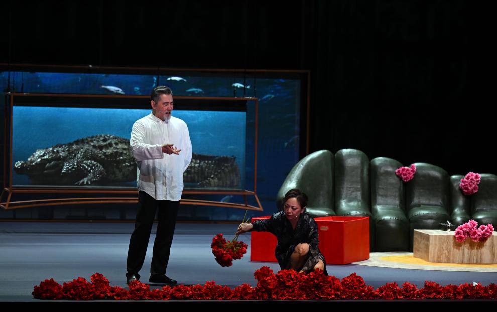 5月3日,演员赵文瑄(右)、白凯南在话剧《鳄鱼》中表演。新华社记者 金良快 摄