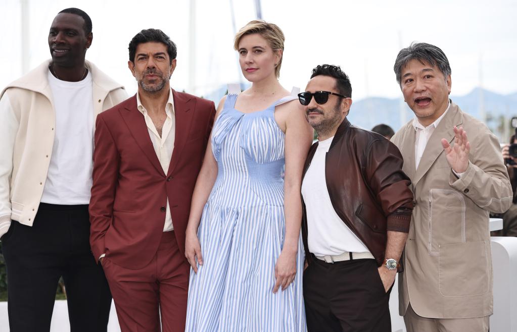 5月14日,在法国南部小城戛纳,第77届戛纳国际电影节主竞赛单元评委会主席、美国电影人格蕾塔·格维希(中)携众评委亮相拍照式。新华社记者 高静 摄