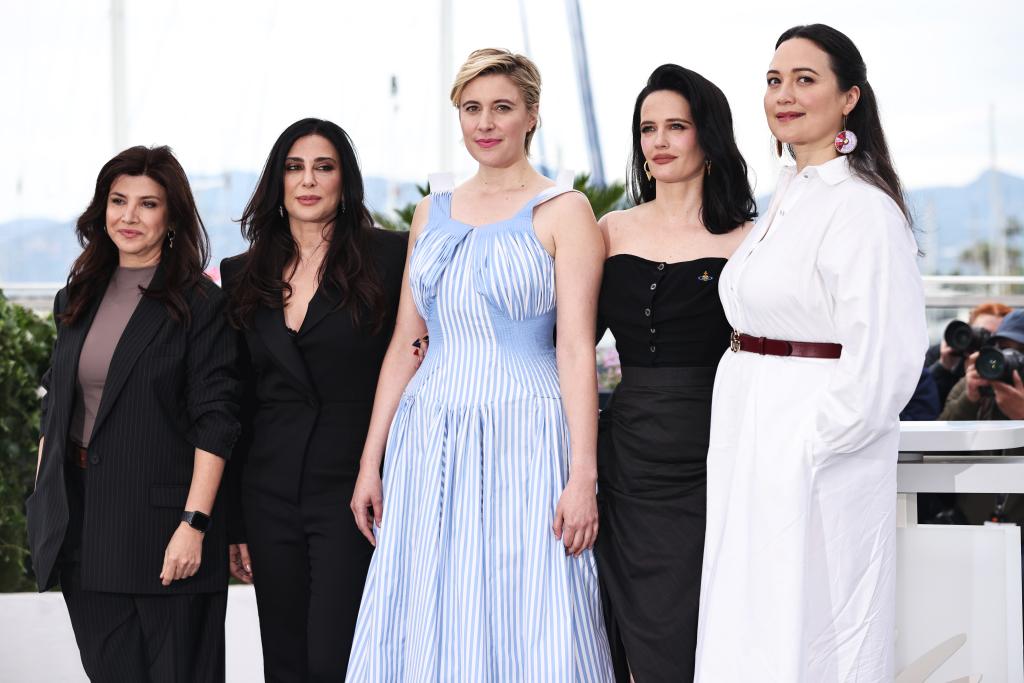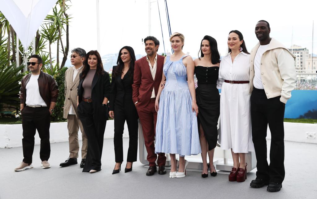 5月14日,在法国南部小城戛纳,第77届戛纳国际电影节主竞赛单元评委会主席、美国电影人格蕾塔·格维希(右四)携众评委亮相拍照式。新华社记者 高静 摄