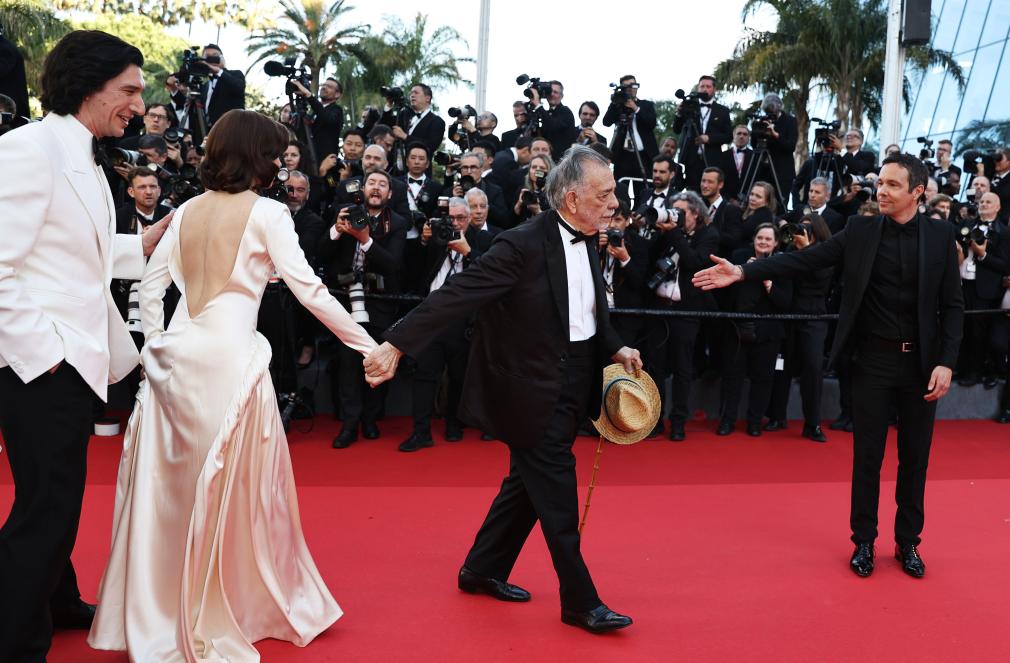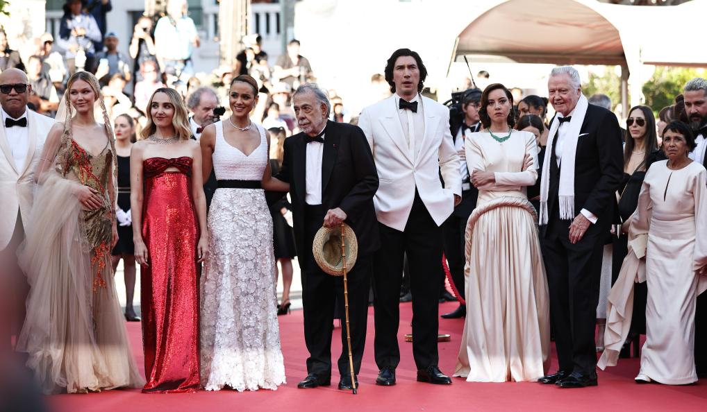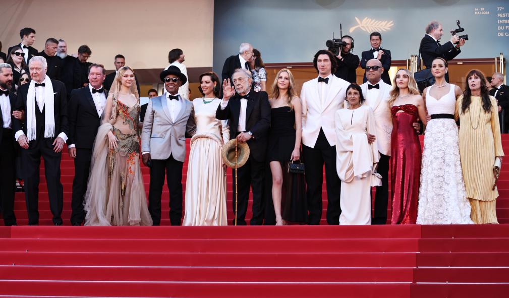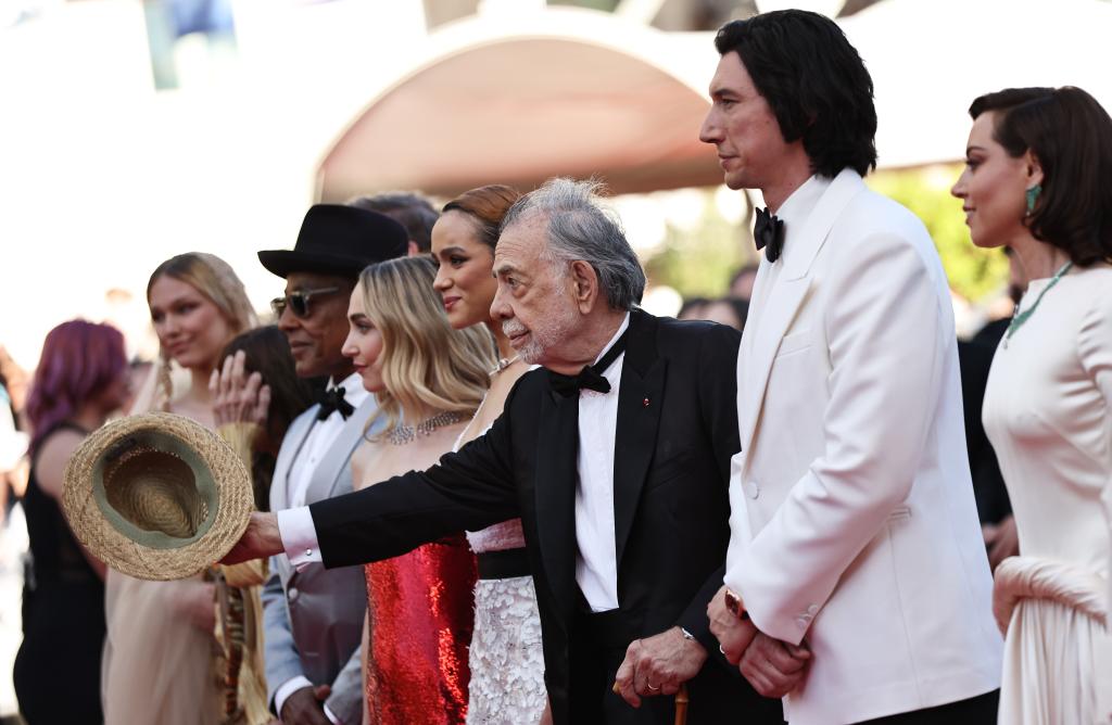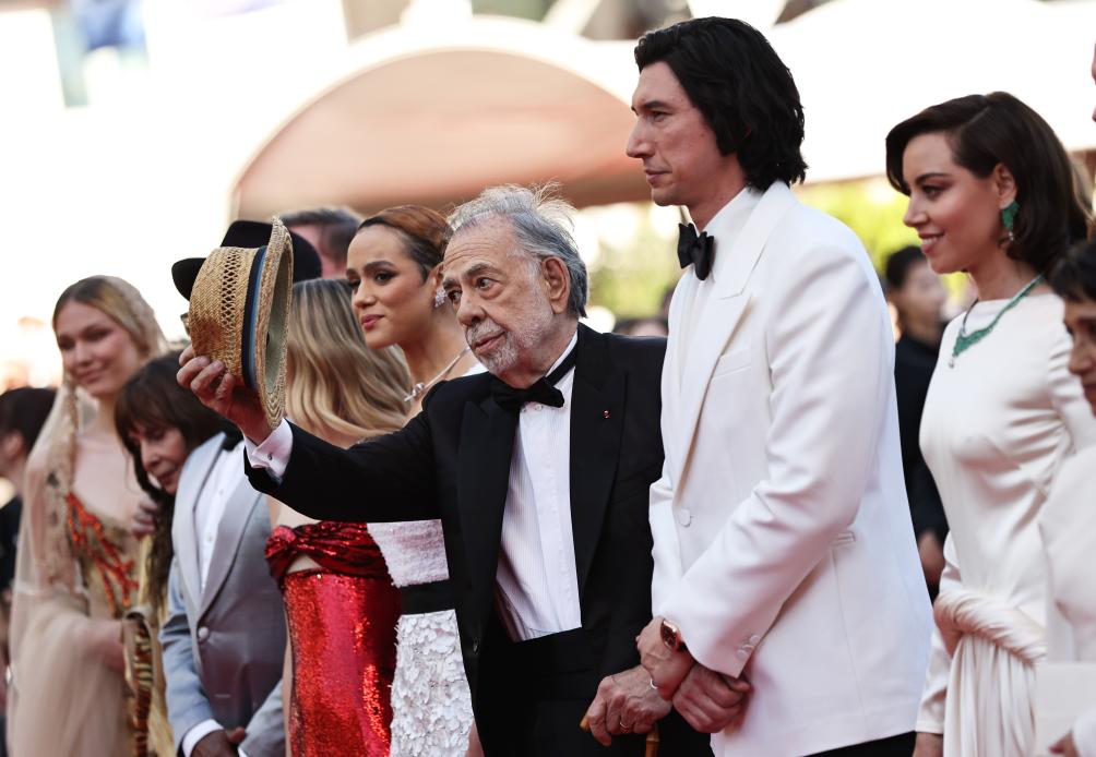 5月16日,在法国南部小城戛纳举行的第77届戛纳国际电影节上,主竞赛单元影片《大都会》的导演弗朗西斯·科波拉(右二)携主创出席首映礼。新华社记者 高静 摄