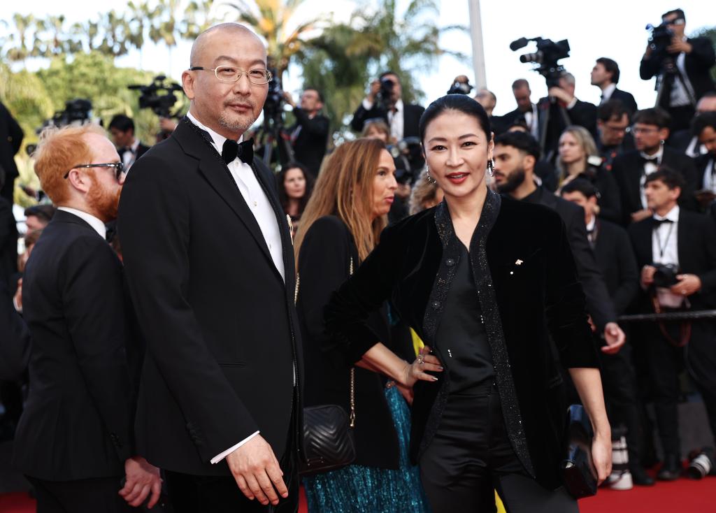 5月16日,在法国南部小城戛纳举行的第77届戛纳国际电影节上,中国导演管虎(前左)、演员梁静(前右)出席主竞赛单元影片《大都会》的首映礼。新华社记者 高静 摄