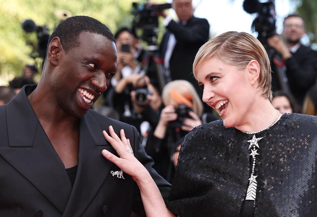 5月16日,在法国南部小城戛纳举行的第77届戛纳国际电影节上,主竞赛单元评委会主席、美国电影人格蕾塔·格威格(右)和评委、法国演员奥马尔·西出席主竞赛单元影片《大都会》的首映礼。新华社记者 高静 摄