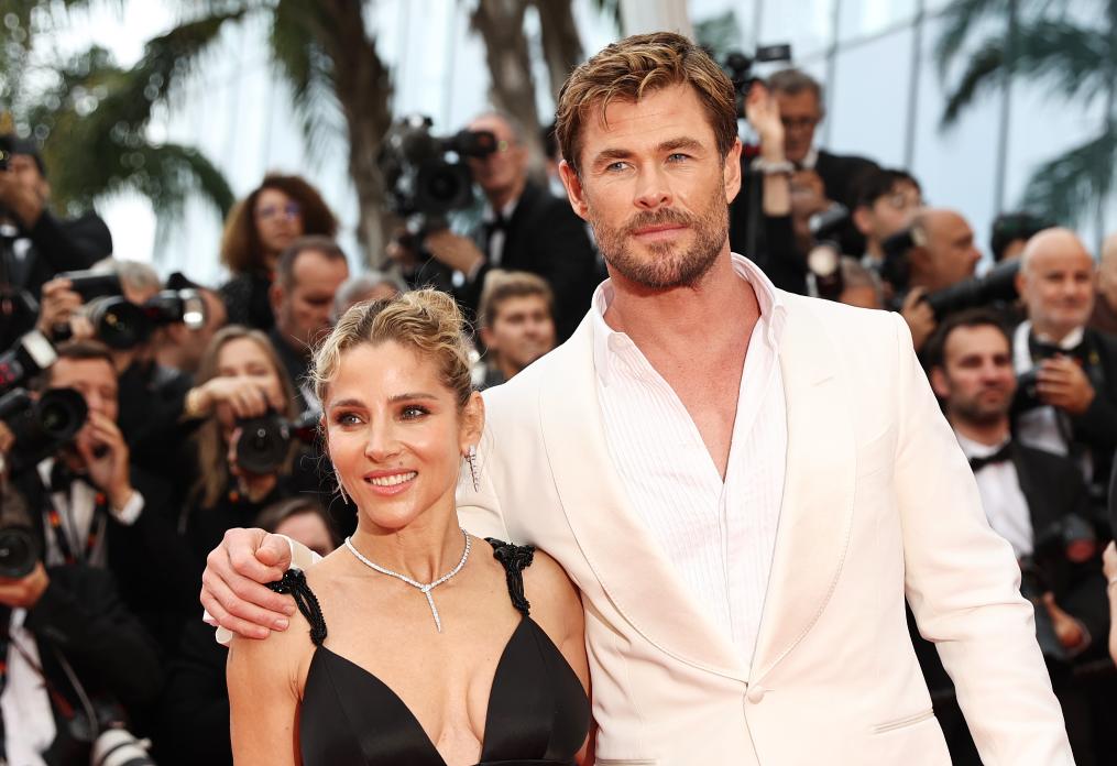5月15日,在法国南部小城戛纳举行的第77届戛纳国际电影节上,影片主演克里斯·海姆斯沃斯与妻子出席非竞赛单元影片《疯狂的麦克斯:狂暴女神》首映礼。新华社记者 高静 摄