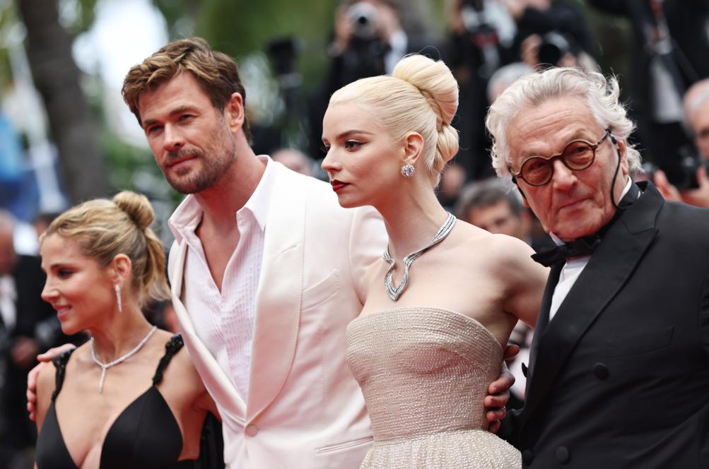 5月15日,在法国南部小城戛纳举行的第77届戛纳国际电影节上,影片导演乔治·米勒(右一)、主演安雅·泰勒-乔伊(右二)和克里斯·海姆斯沃斯(左二)出席非竞赛单元影片《疯狂的麦克斯:狂暴女神》首映礼。新华社记者 高静 摄