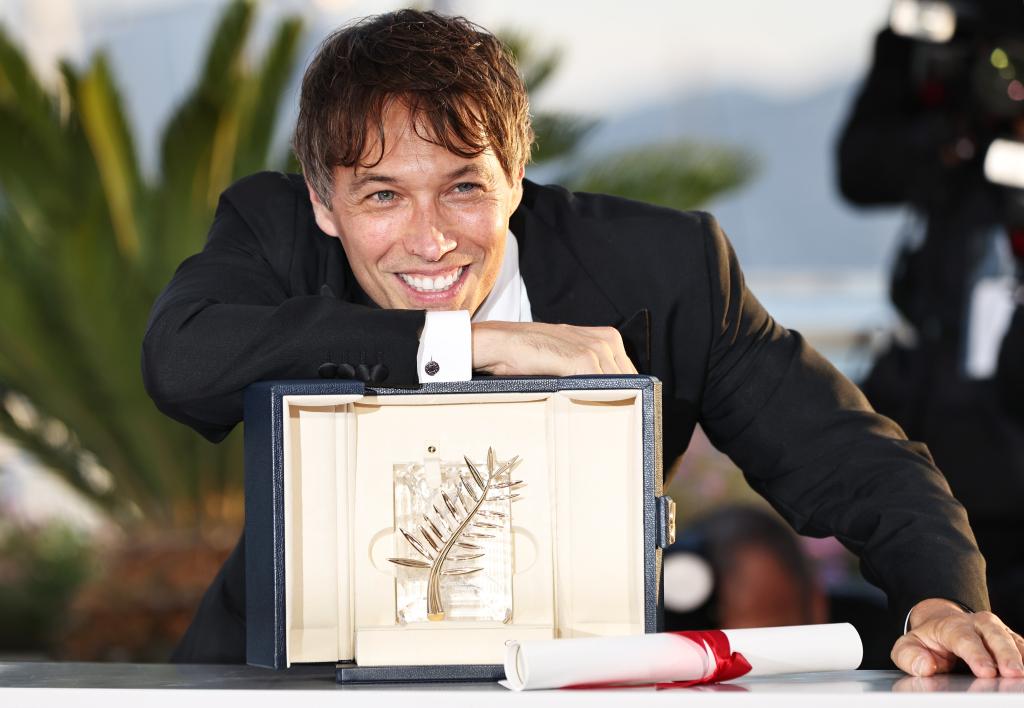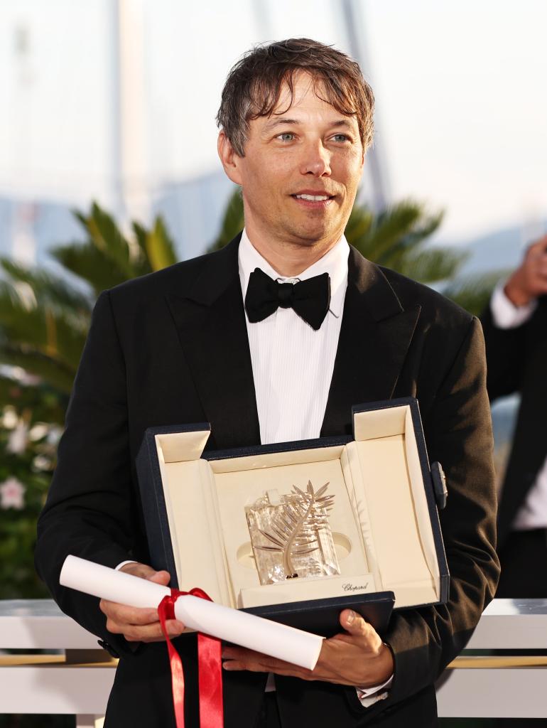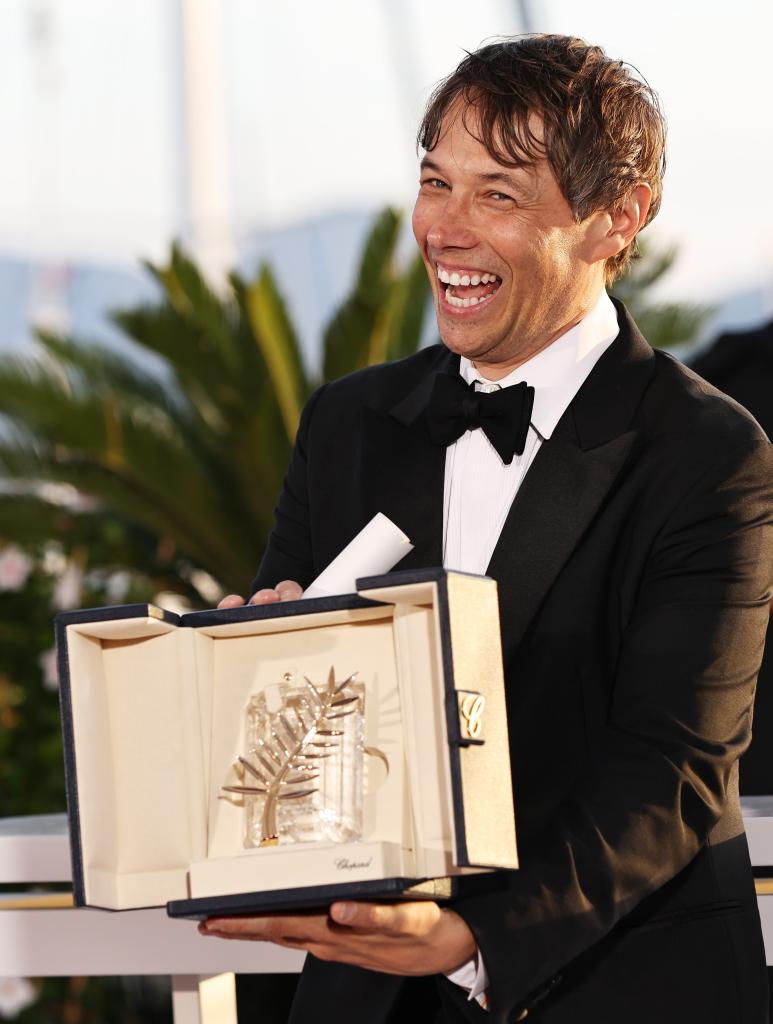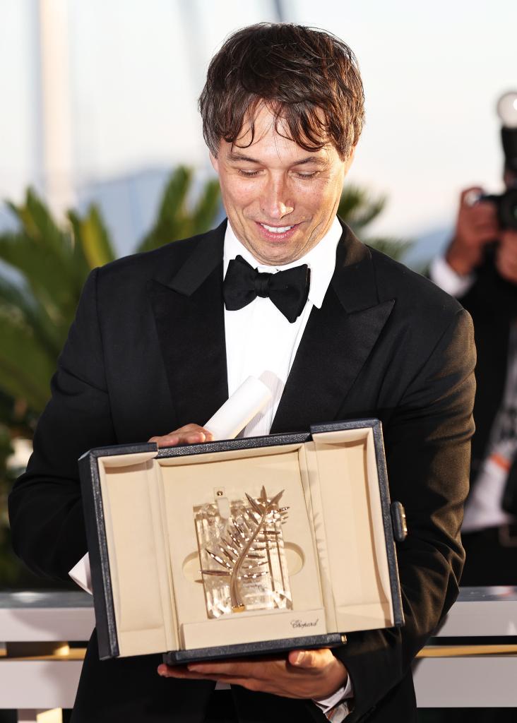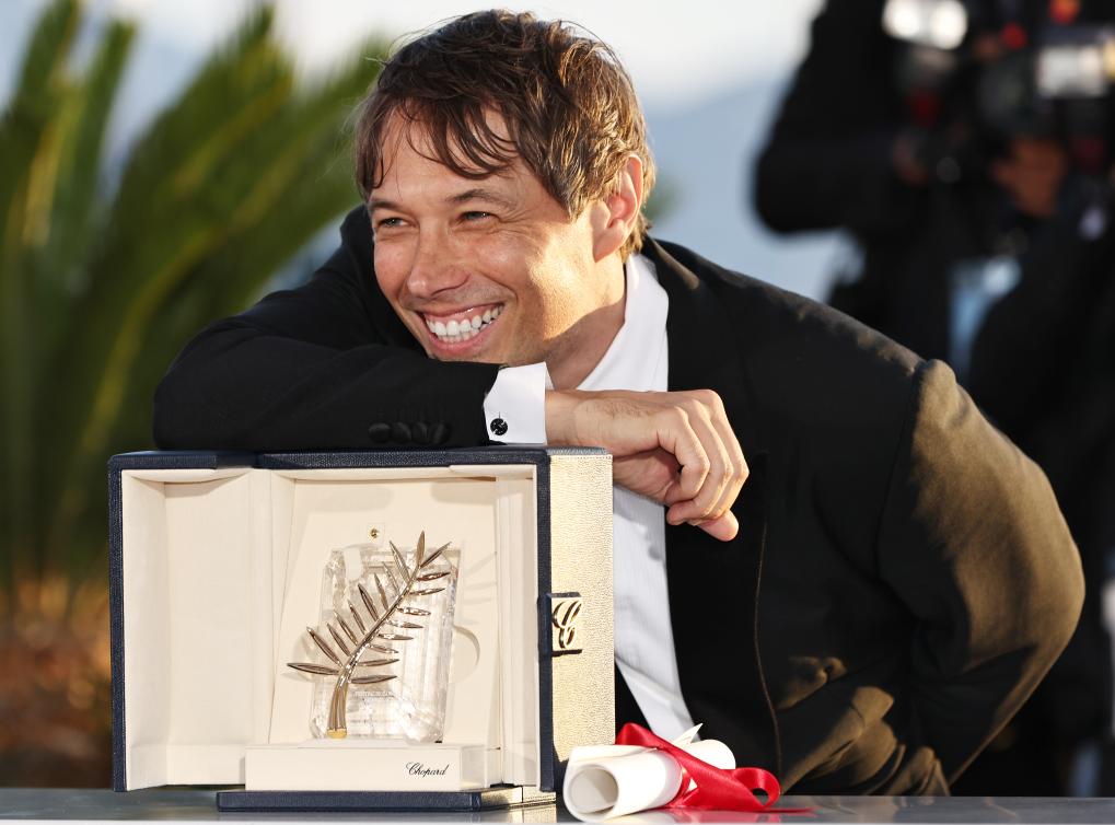 5 月25日,在法国南部城市戛纳举行的第77届戛纳电影节上,美国导演肖恩·贝克与“金棕榈奖”奖杯合影留念。新华社记者 高静 摄