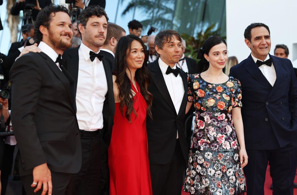5月25日,在法国南部城市戛纳举行的第77届戛纳电影节上,美国影片《阿诺拉》的导演肖恩·贝克(右三)携主创人员踏上闭幕式红毯。新华社记者 高静 摄