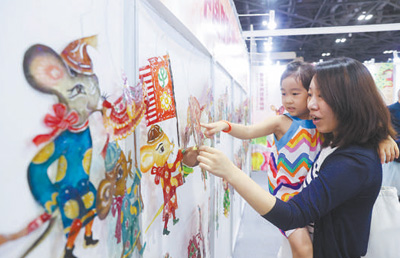 家长与孩子在首届中国(北京)动画周上观看展出的皮影。陈晓根摄
