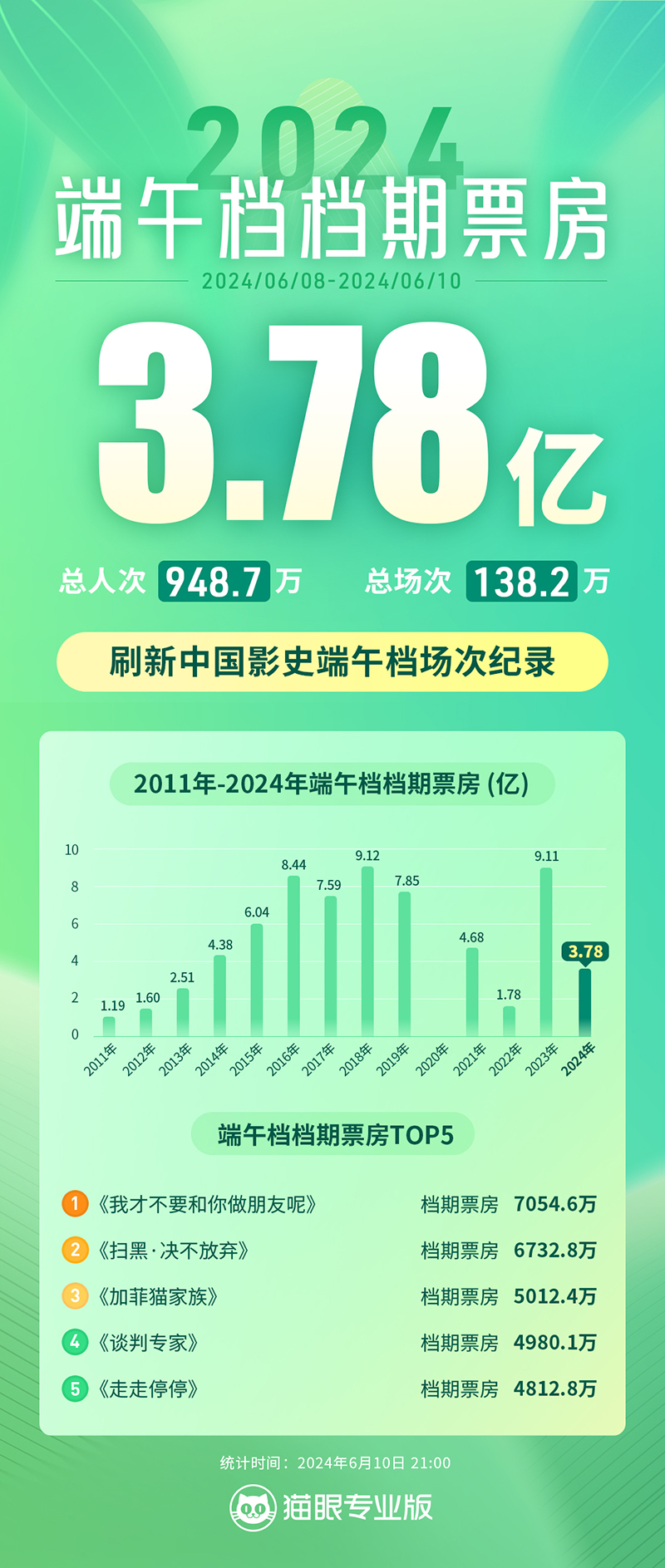 今年端午档共有11部影片上映,相较于去年的10部有所增加,档期内总票房达3.78亿元,票房冠军为《我才不要和你做朋友呢》7054.6万元,第二至第五分别为《扫黑·决不放弃》《加菲猫家族》《谈判专家》《走走停停》。