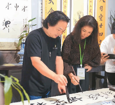 巴西泰坦尼制作有限公司制作人莉莉安娜·罗查·卡瓦萨(右)在广东珠海北山社区体验书法。论坛主办方供图