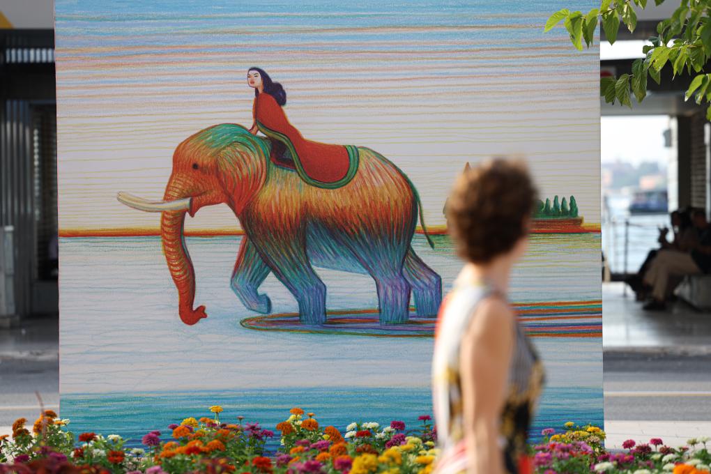 9月4日,在意大利威尼斯利多岛,行人经过一处电影节海报。新华社记者 李京 摄
