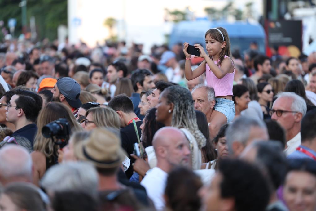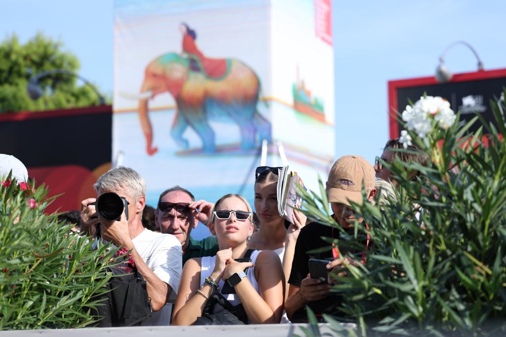 8月31日,在意大利威尼斯利多岛,人们在电影宫前聚集等待红毯仪式开始。新华社记者 李京 摄