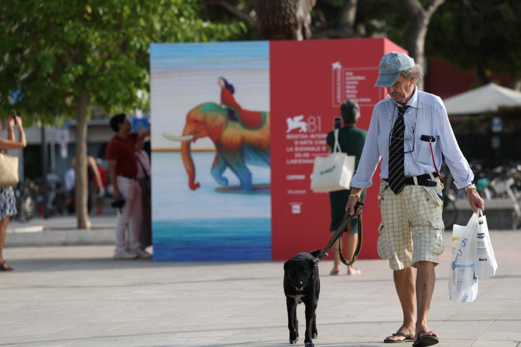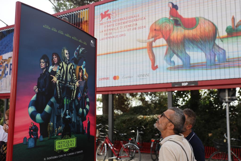 9月4日,在意大利威尼斯利多岛,行人经过威尼斯电影节宣传海报。新华社记者 李京 摄