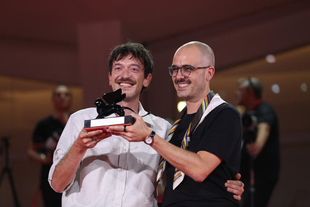 9月7日,在意大利威尼斯,凭借影片《我仍在此》获得最佳编剧奖的穆里洛·奥塞尔(右)和埃托尔·洛雷加与奖杯合影。新华社记者 李京 摄