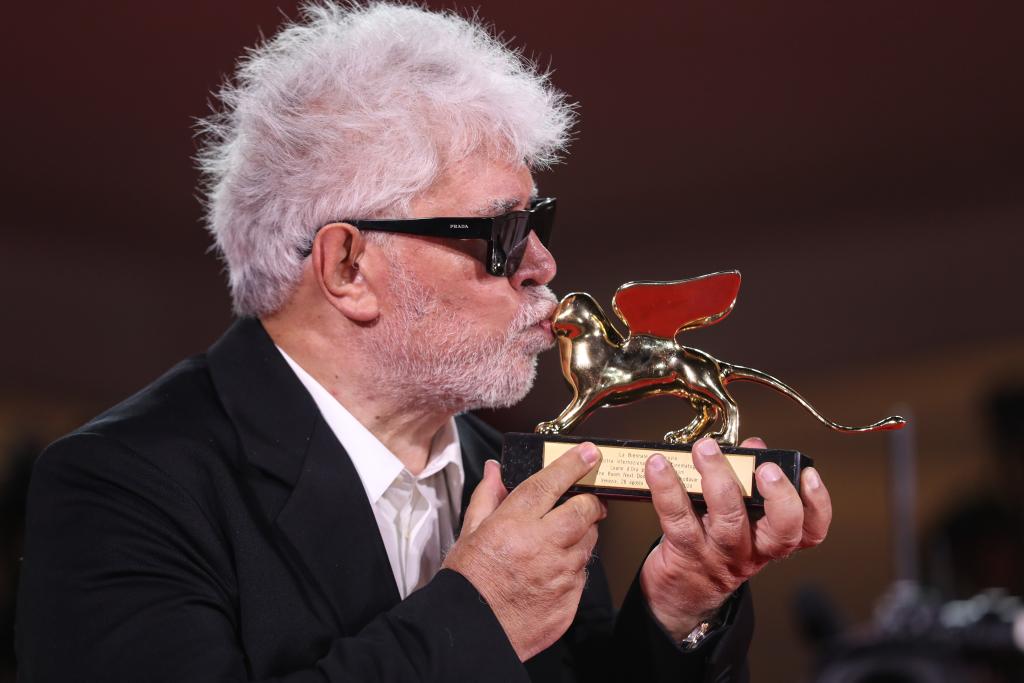 9月7日,在意大利威尼斯,凭借影片《隔壁房间》获得最佳影片金狮奖的西班牙导演佩德罗·阿莫多瓦亲吻金狮奖杯。新华社记者 李京 摄