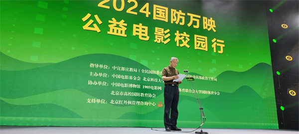 新华网9月11日讯 今天下午为庆祝新中国成立75周年,贯彻落实中共中央宣传部等12个部门印发的《关于组织开展2024年“全民国防教育月”活动的通知》要求,在我国第24个全民国防教育日即将到来之际,由中共中央宣传部宣传教育局、中央军委国防动员部政治工作局指导,中国电影基金会与北京科技大学共同主办,中国电影博物馆、中国学生体育联合会大学国防体育分会、北京市高校国防教育协会、1905电影网协办,北京红丹枫管理咨询中心公益支持的2024“国防万映”公益电影校园行——“强国有我,我爱国防”主题活动在北京科技大学举办。中宣部宣传教育局、中央军委国防动员部政治工作局、中共北京市委宣传部、北京市教育委员会及中国电影基金会、北京科技大学、中国电影博物馆等单位有关领导及北京科技大学2024级新生等约3600人共同参加了此次活动。