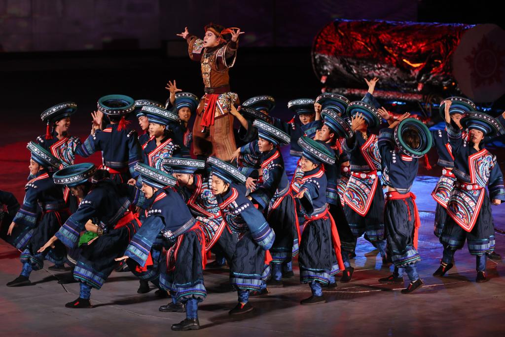 9月20日,演员在贵州省雷山县大塘镇表演苗族歌舞诗剧《仰欧桑》。新华社发(杨武魁摄)
