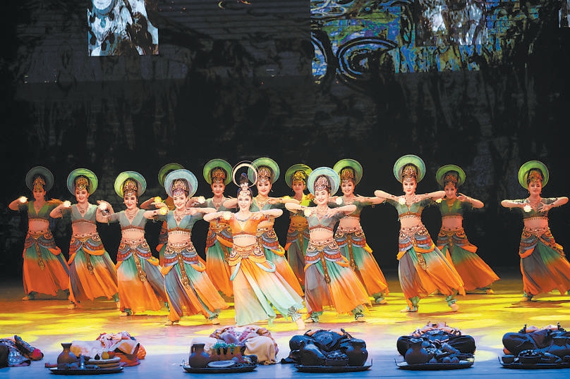 “创作时,剧中有一场戏我一直不知道怎么排。”王舸说的正是春君带着奉和建特逛精绝城集市的“集市舞”,那里有烟火气的生活、各色的民俗艺术表演,“我心里想的是56个民族56朵花,我要把丝绸之路上民族融合的盛景都表现在这个场景中。”