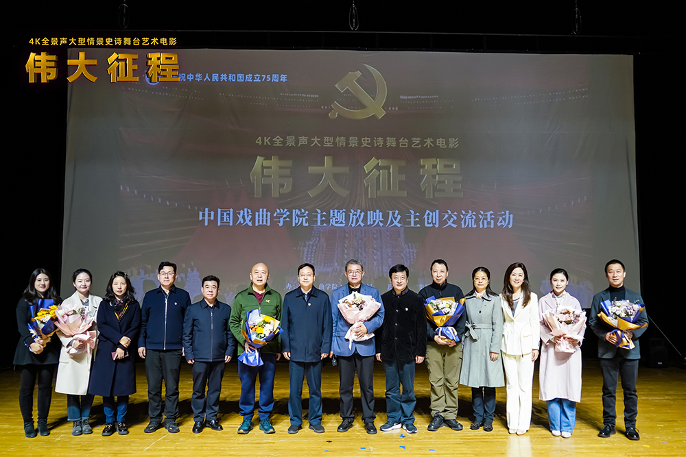 纪录电影《伟大征程》近日在中国戏曲学院大剧场举行了庆祝中华人民共和国成立75周年主题放映及主创交流活动。这部历时数年精心打造、国内首部采用4K全景声技术的大型情景史诗舞台艺术电影,激发了师生们的深刻思考与感悟。