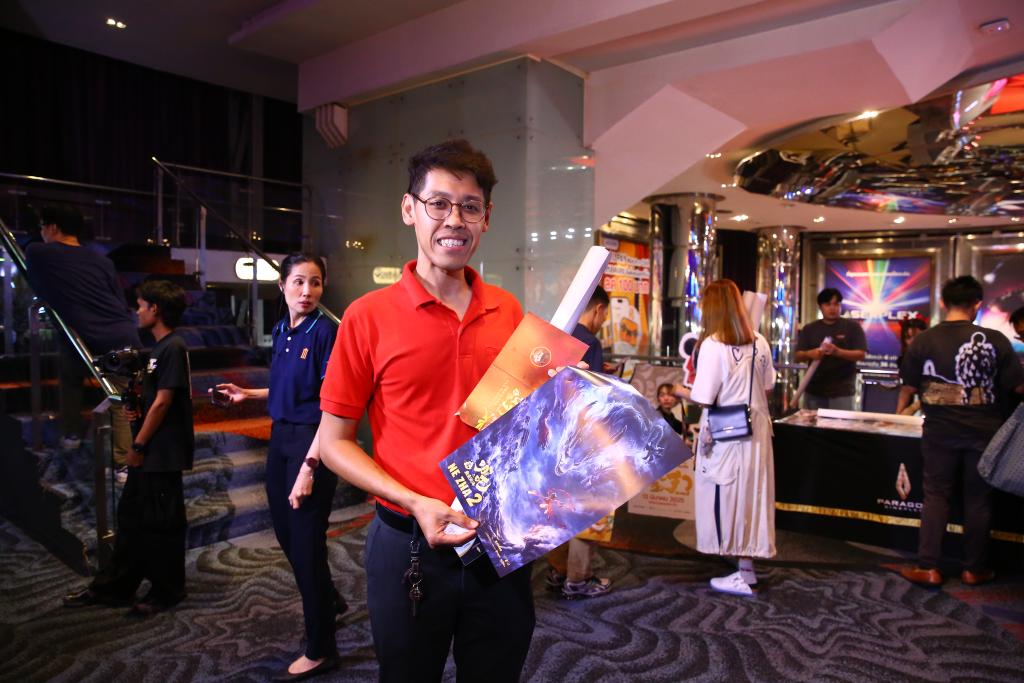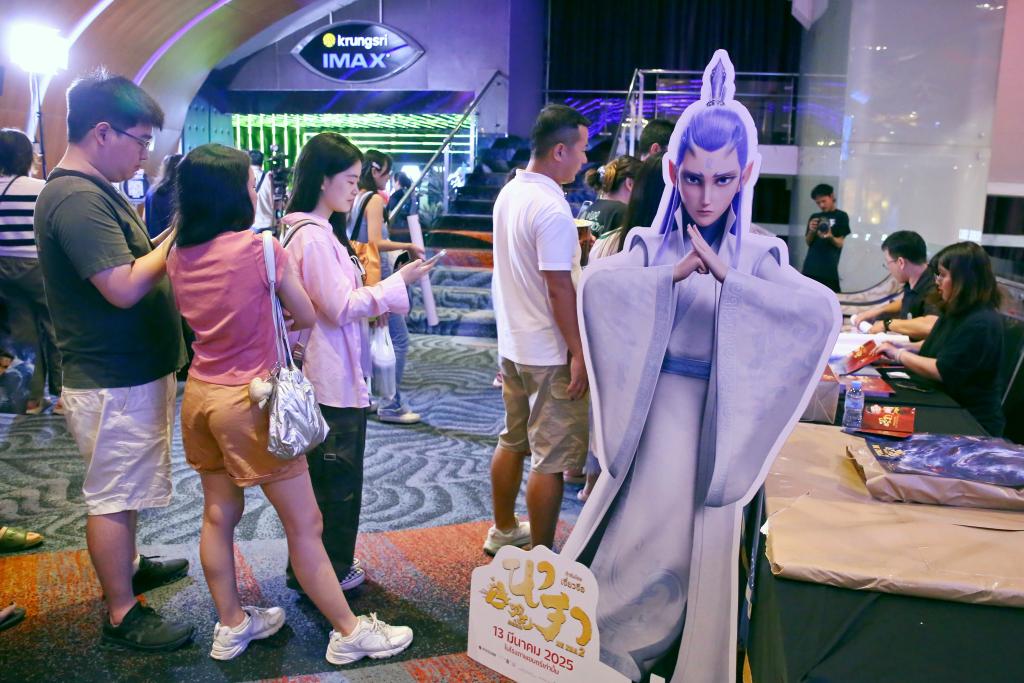 3月12日,在泰国曼谷暹罗百丽宫,参加《哪吒2》首映活动的观众排队领取电影海报。新华社记者 孙玮彤 摄