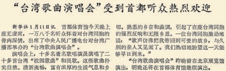 随着海峡两岸交流的增多,台湾的齐秦、齐豫、伍思凯、赵传、周华健等深受歌迷喜爱的歌手,纷纷来到北京举办演唱会。1991年冬,工人体育馆的全球华人同根演唱会已过结束时间,可场内热情的观众仍不肯离去。已回到后台的齐秦,在歌迷们一浪高过一浪的热情呼唤下,又回到台前献上一首《爱情宣言》。1万余名歌迷忘情地鼓掌应和着,呼喊着……(1991年12月14日《北京日报》5版,《华人同根》)