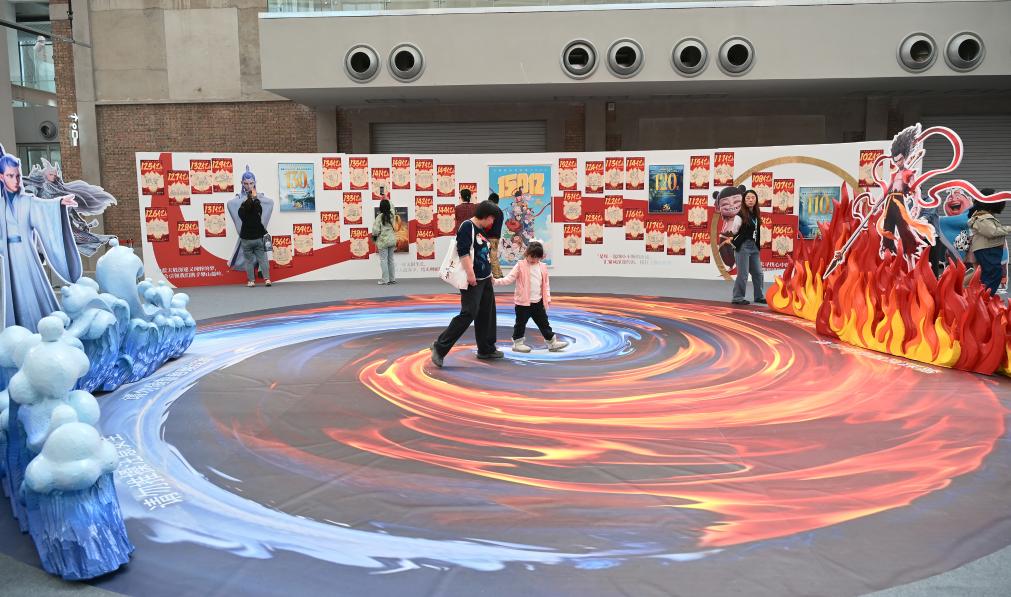 4月19日,观众从电影《哪吒之魔童闹海》破亿手绘海报展展示的电影衍生文创产品前走过。新华社记者 李鑫 摄
