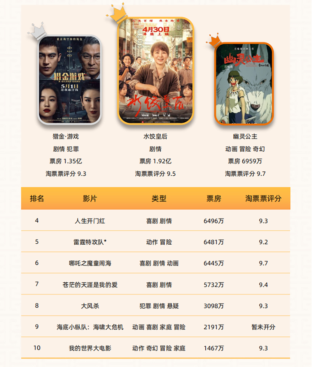 今年五一档新片体量较为均衡,冠军影片《水饺皇后》档期内斩获1.92亿元,成为唯一突破1.5亿票房的新作。该片以真实故事为蓝本,讲述女性创业奋斗史,凭借高情感共鸣覆盖全国29个省份票房榜首。犯罪题材影片《猎金·游戏》以1.35亿元紧随其后,在华南地区尤其是广西表现突出;宫崎骏经典动画《幽灵公主》首次登陆内地银幕,豆瓣评分8.9,以6959万元跻身前三。