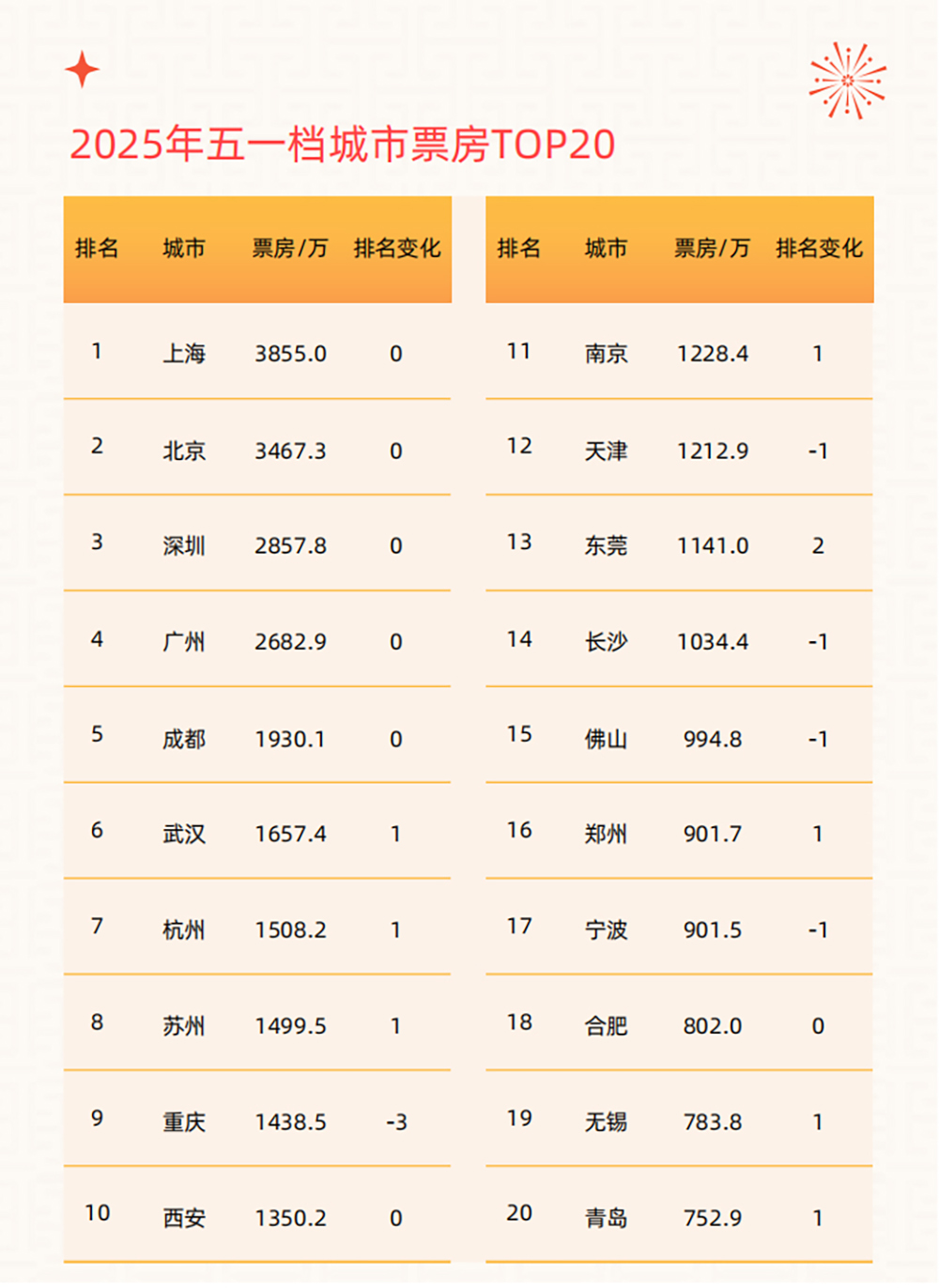 五一期间,异地购票占比24.8%,同比上升0.7个百分点,衡阳、三亚、湘潭等三线城市位列人口流动活跃榜前列。票房城市TOP10中,上海以3855万元稳居榜首,北京、深圳分列二、三位,武汉、杭州、苏州排名较去年提升。