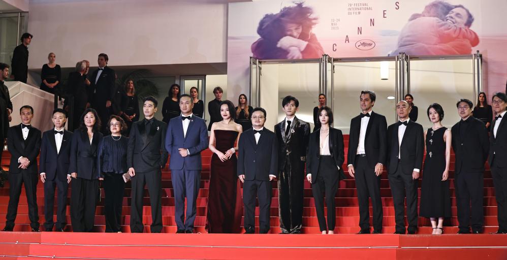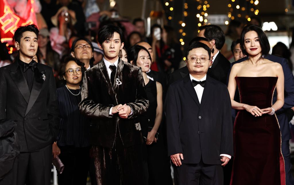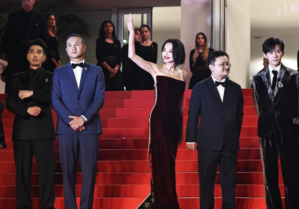 5月22日,在法国南部小城戛纳举行的第78届戛纳国际电影节上,导演毕赣(中)携主创出席影片《狂野时代》首映礼。