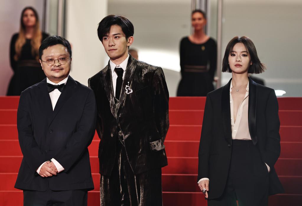 5月22日,在法国南部小城戛纳举行的第78届戛纳国际电影节上,导演毕赣(左)和演员易烊千玺(中)、李庚希(右)出席影片《狂野时代》首映礼。