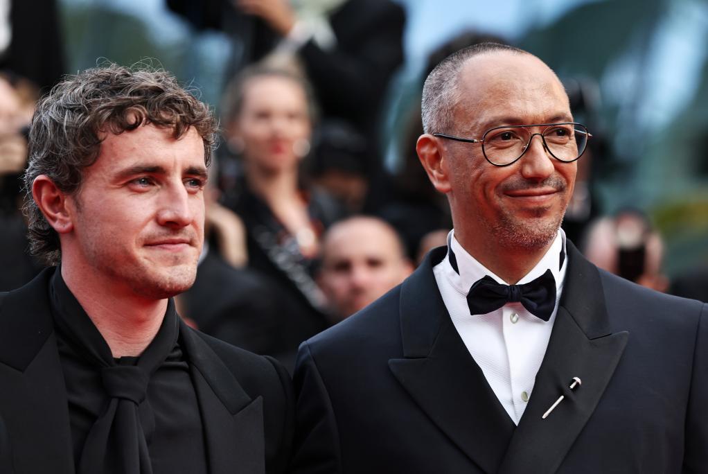 5月21日,在法国南部小城戛纳举行的第78届戛纳国际电影节上,主竞赛单元影片《时光留声》的影片主演、爱尔兰演员保罗·麦斯卡(左)和导演奥利弗·赫曼纽斯出席该片首映式。新华社记者 高静 摄