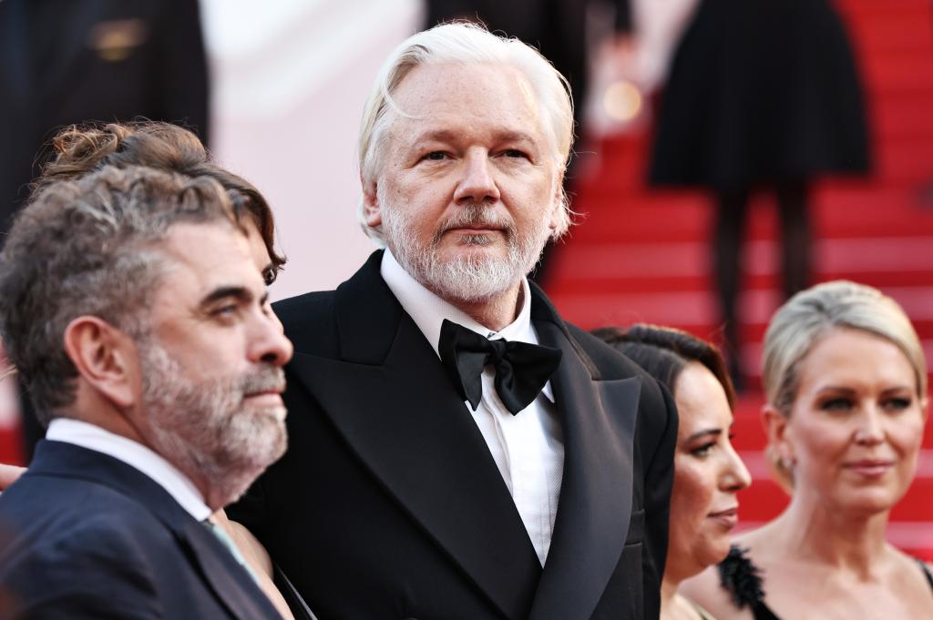 5月21日,在法国南部小城戛纳举行的第78届戛纳国际电影节上,“维基揭秘”网站创始人朱利安·阿桑奇与传记影片《60亿美金先生》的主创出席主竞赛单元影片《时光留声》首映式。新华社记者 高静 摄