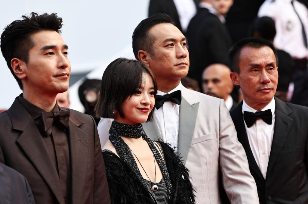5月24日,在法国南部小城戛纳,中国影片《狂野时代》导演毕赣(右五)携主创人员踏上闭幕式红毯。新华社记者 高静 摄