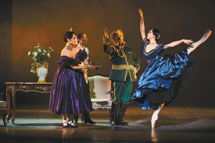 1936年由葛丽泰·嘉宝主演的电影《茶花女》中有一个十分动人的小细节,阿尔芒在剧院初见茶花女,对其一见倾心,奈何公爵携她离去。阿尔芒站在她离开前的位置,捡起了她遗落的手套,待再次重逢时掏出献予佳人。无需多言,情意便了然,他早已是她的裙下臣。类似此般细节在舞剧中没能见到,是为一种遗憾。(赵晨 供图/上海芭蕾舞团)