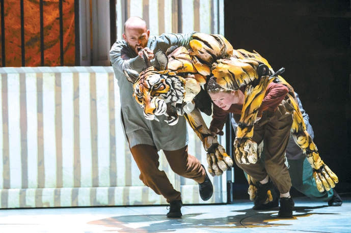 但是日本木偶对西方戏剧的影响不仅是独特的操纵形式或聪明的道具机关。偶师在操纵木偶时并不遮掩自己,三四个木偶演戏时,台上就拥挤着十几个老中青师傅,这些独特的现象提示着戏剧的另一种可能性。而英国戏剧舞台善于仰取俯拾,《少年派》动物园中活灵活现的各种生物就是虚拟写意与严密科研的成果,作为代表的老虎理查德·帕克,甚至可以视为艺术本源的象征。