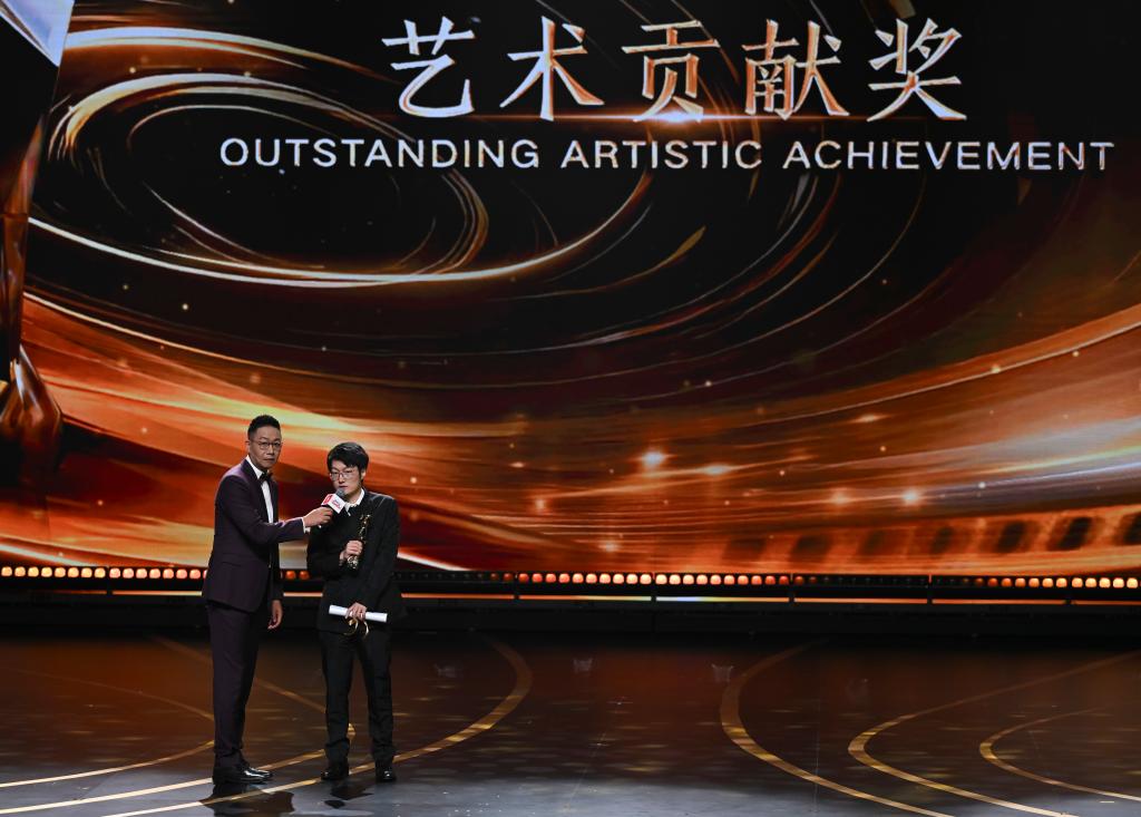 6月21日,获得金爵奖艺术贡献奖的《比如父子》导演仇晟(右)上台领奖。新华社发(陈浩明摄)