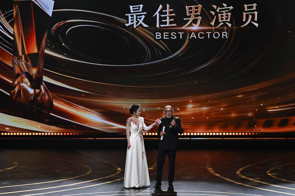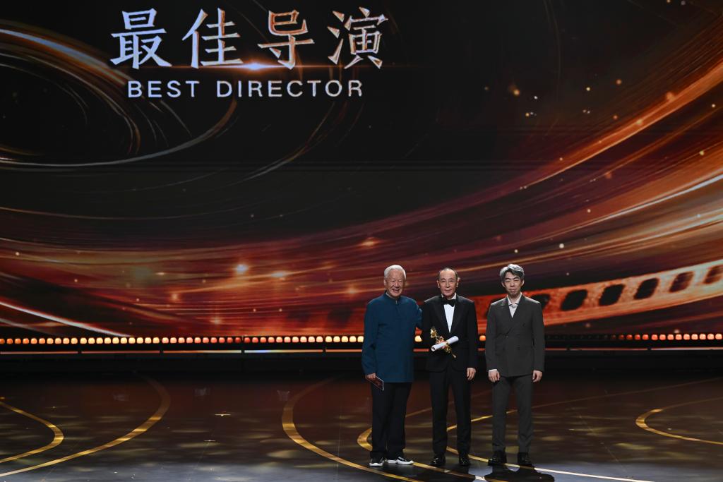 6月21日,获得金爵奖最佳导演奖的导演曹保平上台领奖。新华社发(陈浩明摄)