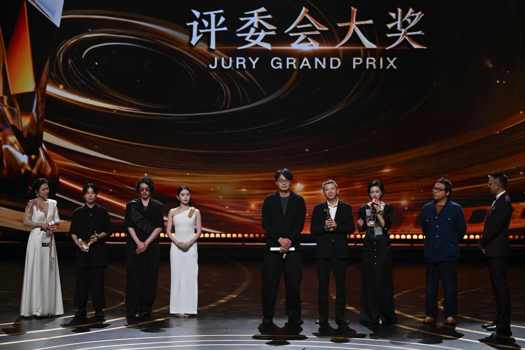 6月21日,获得金爵奖评委会大奖的日本影片《夏日沙上》剧组(左)和中国影片《长夜将尽》(右)剧组上台领奖。新华社发(陈浩明摄)