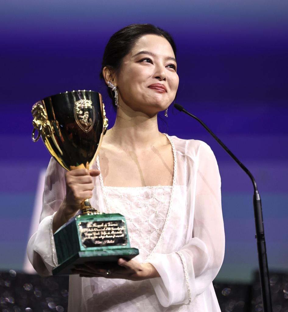 9月6日,在意大利威尼斯,辛芷蕾夺得第82届威尼斯电影节最佳女演员奖。新华社记者 李京 摄