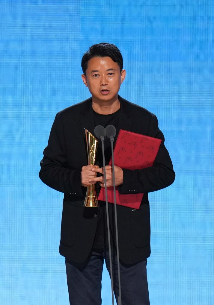 9月13日,在第二届金熊猫盛典上,纪录片单元最佳导演奖得主高松发表获奖感言。新华社记者 江宏景 摄