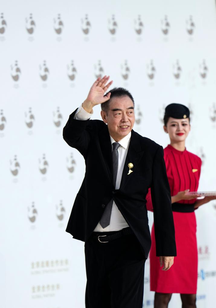 9月13日,评委会主席陈凯歌(左)走在第二届金熊猫盛典的“金熊猫大道”上。新华社记者 江宏景 摄