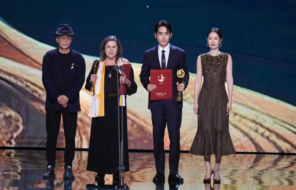 9月13日,在第二届金熊猫盛典上,电影单元最佳男主角朱一龙(右二)、最佳女主角黛丽丝 ·韦恩伯格(左二)与颁奖嘉宾曹保平(左一)、刘敏涛合影。新华社记者 江宏景 摄