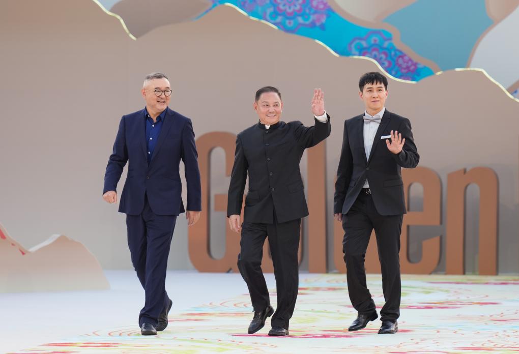9月13日,导演宁海强(左)、演员卢奇(中)和王梓源走在第二届金熊猫盛典的“金熊猫大道”上。新华社记者 江宏景 摄