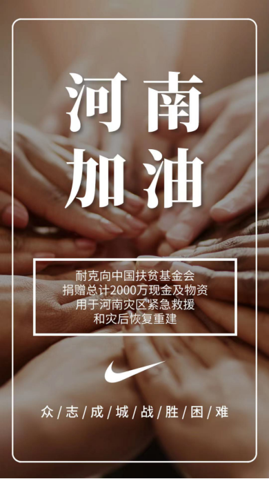 近日,河南大部分地区出现罕见持续暴雨、大暴雨现象,多地出现内涝、洪水,受灾严重,且仍有持续下暴雨趋势,防汛任务十分艰巨。耐克紧急宣布向中国扶贫基金会捐赠人民币2000万元现金及物资支持河南灾区紧急救援和灾后恢复重建。