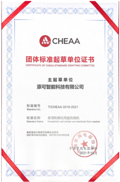2021年10月20日,中国洗地机行业首个标准——中国家用电器协会团体标准T/CHEAA 0018—2021《家用和类似用途洗地机》在北京正式发布。在中国家用电器协会的号召带领下,洗地机市场引领者添可作为组长单位,积极联合行业同行,共同推动本次标准起草制定和践行。这一标准以满足市场和创新需求为目标,聚焦新技术、新产业、新业态、新模式,明确了洗地机产品的性能指标,打破了目前洗地机行业无标准可依的行业现状,为企业产品研发和质量管控提供了依据,对于洗地机的加速普及具有重要意义。
