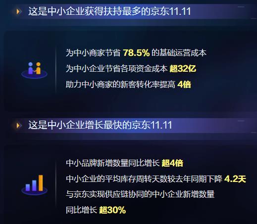 数据显示,今年中小企业参与京东双11的门槛进一步降低,与去年相比,新增超过4倍的中小品牌参与了京东双11,新增超过30%的中小企业与京东实现供应链协同。京东为中小商家节省78.5%的基础运营成本,助力新客转化率平均提高4倍、库存周转天数平均同比下降4.2天。