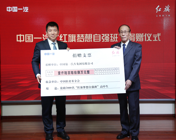 12月9日,中国一汽“红旗梦想自强班”捐赠仪式在北京举行。中国一汽向中国扶贫基金会捐赠2021年“红旗梦想自强班”助学金1668万元,用于支持脱贫地区的万余名学生实现求学梦想,以实际行动助力人才振兴,助推乡村振兴。