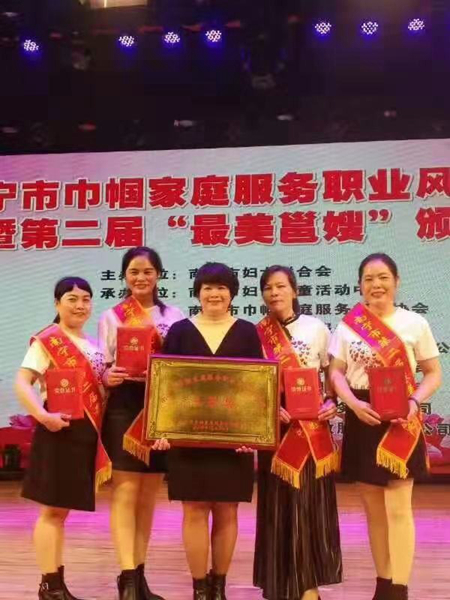 2012~2014年,带领团队参加广西电视台都市频道举举办的“超级保姆”评选活动,其中有三位家政人员荣获“超级保姆”的称号。2013年我带领团队参加南宁市首届家政服务综合技能大赛荣获团体组织奖。2014年带领公司团队参加南宁市商贸系统服务世锦赛家政服务综合技能大赛荣获母婴护理组和家庭保洁组优秀组织奖。2015年参加南宁市家政服务综合技能大赛荣获优秀组织奖。2019年3月,参加南宁市妇联和南宁市巾帼家政协会举办的首届“最美邕嫂”评选活动,我们公司推荐的5位阿姨荣获“最美邕嫂”的称号。2020年12月,参加第三届“最美邕嫂”评选活动,公司有10位阿姨荣获“最美邕嫂”的称号。