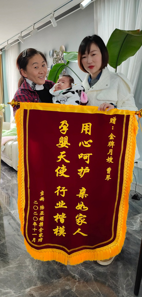 在从事母婴工作的这几年,曹琴用自己的专业技能和赤诚的爱去对待每个产妇和新生宝宝。一直让她记忆深刻有这三个故事:一个是二胎剖腹产宝宝。因为羊水少提前剖腹,宝宝的心跳和呼吸都不太正常,曹琴以专业的态度首先劝说家人要冷静并细心观察,听医嘱,经过几天几夜细心护理,宝宝健康出院。产妇第一胎母乳不足,未能母乳喂养,但是二胎希望能纯母乳喂养,曹琴就每天以专业手法给产妇按摩、热敷等,再加上精心准备月子餐,二胎成功进行母乳喂养。最后产妇很满意并赠送了曹琴一面锦旗。还有一个是早产儿。接到这单时宝宝的家人已经换了两个月嫂,产妇也有了产后抑郁。经过曹琴对宝宝的护理调养以及对产妇的耐心开导和陪伴,一个月后,宝宝身体健康,产妇的心理状态也得到改善。另外一个是溶血型黄疸宝宝。为照顾好这个孩子,曹琴连续几天几乎没闭眼睡觉,严格按照医嘱,同时充分运用了自己所学的母婴知识悉心照顾,最后宝宝身体恢复得十分健康,客户一家人终于展露笑颜。