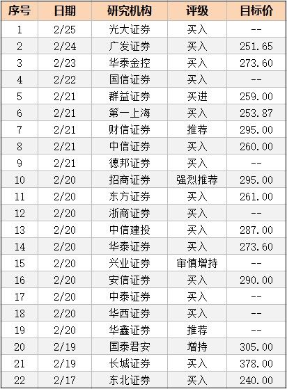 作为行业龙头企业及白酒板块优质标的,五粮液在资本市场上一直拥有较高的关注度。据不完全统计,近一个月内,已有17家券商针对五粮液重大事项撰写深度研报,22家券商发布最新投资评级,且清一色为“买入”“增持”等正向评级,目标价自240元/股至378元/股不等。