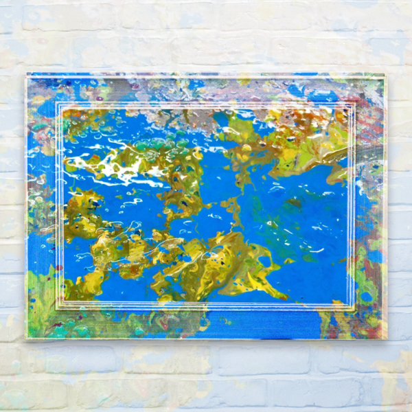 采用情绪宣泄艺术干预手法,将湖蓝色泼洒在黄色基底上,使画面呈现出地图样式